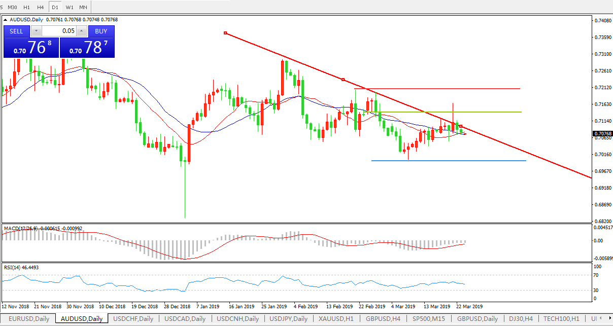 美元指数延续昨日涨势持续上扬,一度触及96.81高位。美元指数突破了重要水平阻力96.50,走势可能扭转3月7日以来这波跌势转强。由于英国脱欧的不确定性增加,该指数从200日均线反弹。美元指数今日继续上行,如收于96.70之上应会引发进一步买盘。澳元多日上行成果瞬间灰飞烟灭,且有进一步下行迹象。