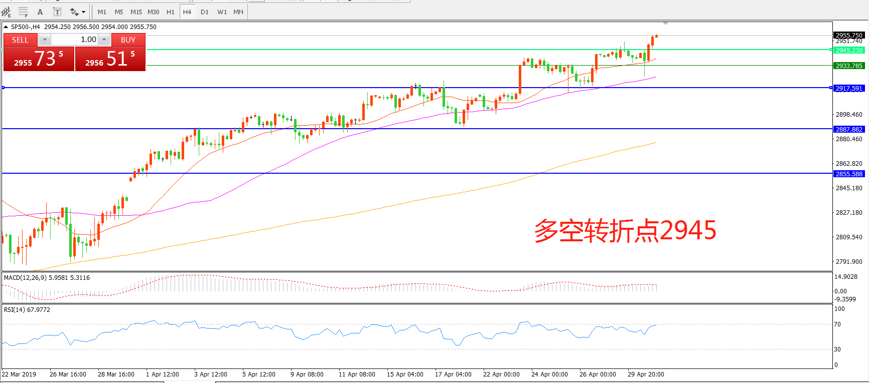 4小时图看,标普500以21均线为依托逐阶上行, 整体走势十分强势,均线系统呈多头排列,但MACD红柱增加,RSI指标拐头向上下,日内仍以多头思路为主。
