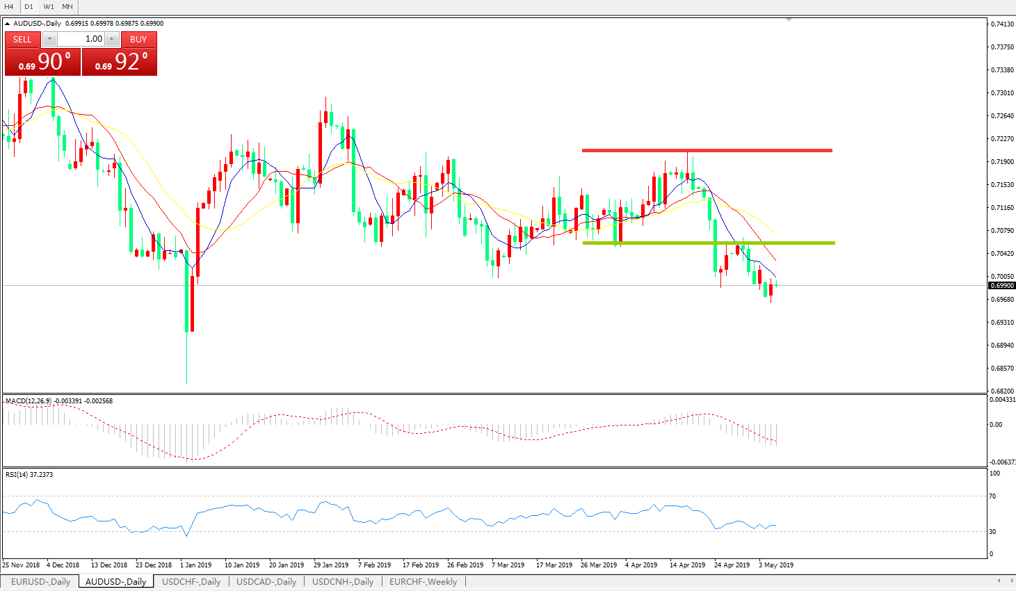 技术面简析:日图均线有序空头排列看跌,汇价多空转折区域下方弱势反弹,MACD下穿0轴且动能柱0轴下方放量,RSI低位弱势反弹,预计汇价反弹整理后将进一步下行。