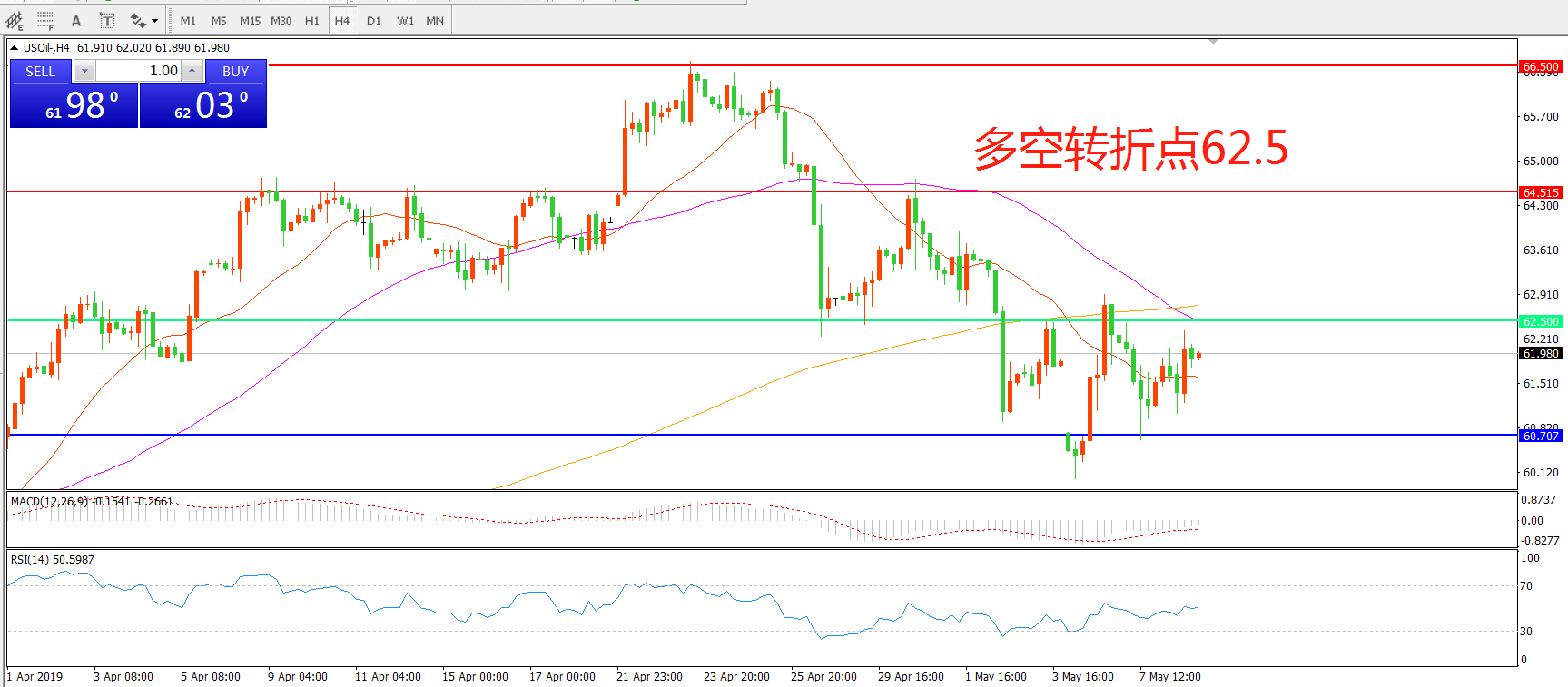 4小时图看,油价整体呈现震荡形态,振幅逐渐收窄,上方62.5形成短期阻力,60美金成为下方支撑,55均线下穿形成死叉,MACD绿柱减少, RSI指标走平,日内延续震荡概率较大。