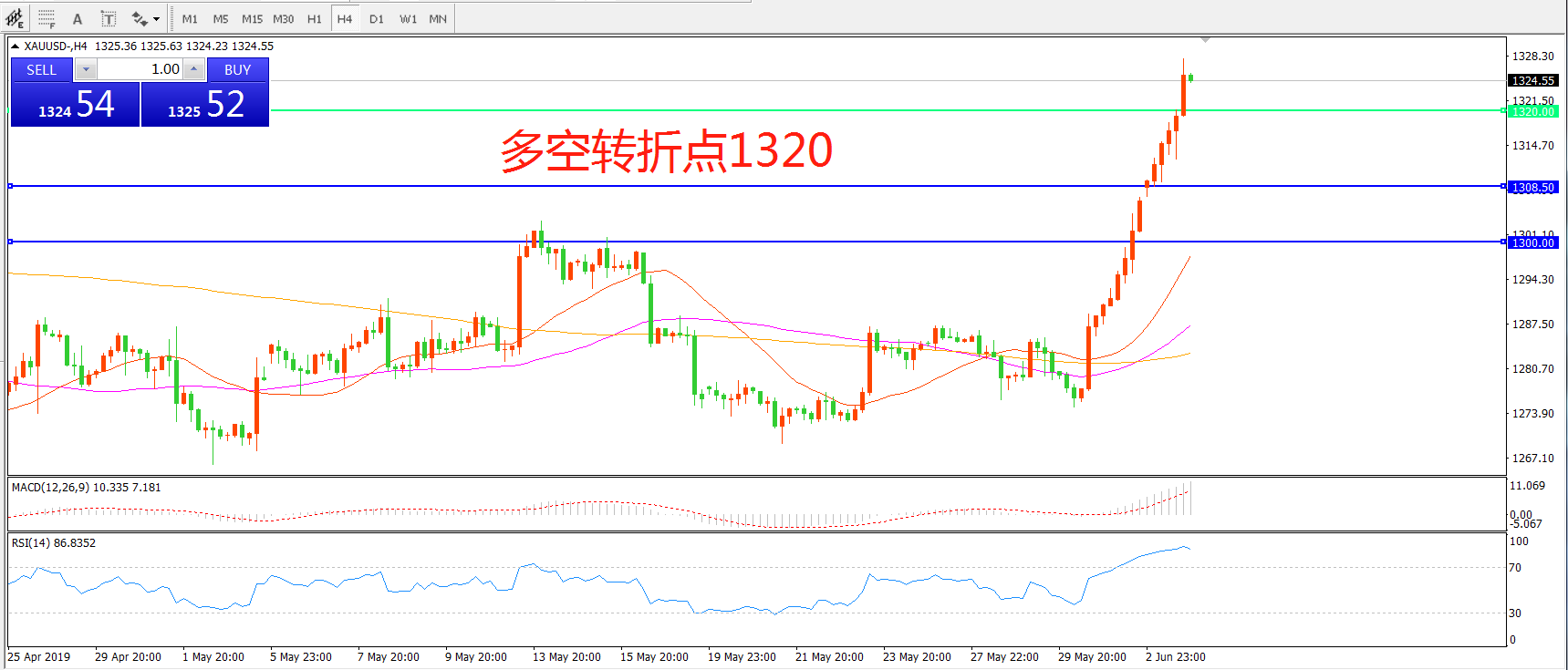 周一(6月3日)美市盘中,美国公布的ISM制造业指数、营建支出以及Markit制造业PMI均表现不佳,数据公布之后,美元指数延续先前跌势,刷新日低至97.51,且鉴于全球贸易紧张局势以及美国通胀疲弱对经济增长构成的风险不断上升,美国“可能很快”就会降息。现货黄金开启飙升模式,涨逾20美元,收报1325.1美元/盎司,创2月27日以来新高。