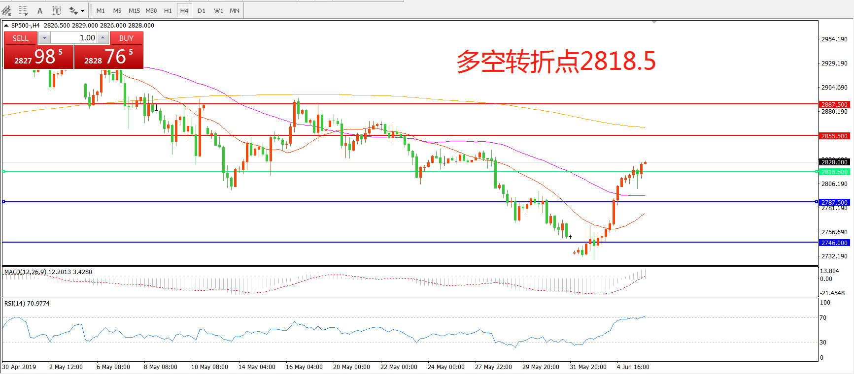 4小时图看,标普低位连续反弹,突破多空分水岭2787.5后直指上方阻力,短期均线有拐头迹象,MACD绿柱缩短,RSI指标拐头向上,日内有延续反弹可能.