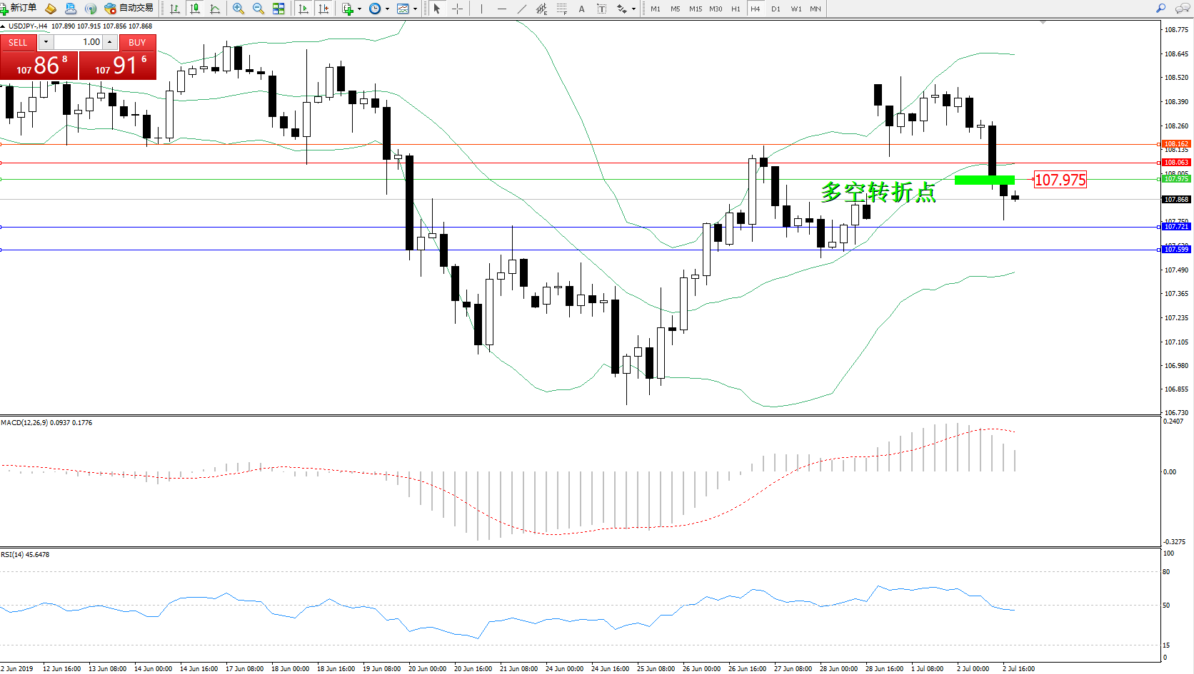 美元兑日元弱势下跌,原因在于投资者对于全球经济前景顾虑犹存,且仍押注美联储本月底将启动降息。此前,美股标普500指数在周一开盘创出新高后日内回落回吐大部分跌幅的走势们同样带动了美元兑日元回落,市场仍在观望此后以6月非农就业报告为首的一系列美国经济数据,以及美联储官员的评述,在此之前,进一步追高美元的投资意向暂时受到了遏制。而此前数度攻而不破的108.50-60区间仍是美元兑日元短线的强阻力,但下方108关口却也有着较强的支撑。在美联储降息前景随着美国更多数据出炉而更趋明朗化之前,盘整走势料仍将延续。