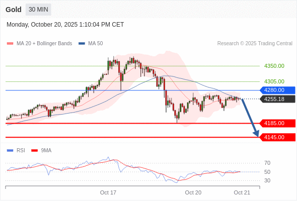 在 4280.00 之下,看跌,目标价位为 4185.00 ,然后为 4145.00 。