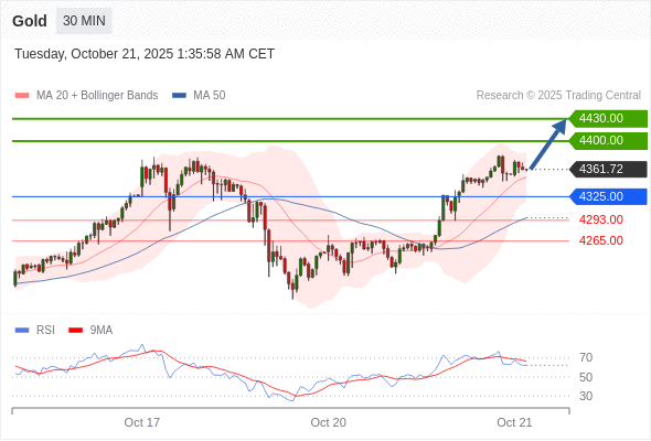 在 4325.00 之上,看涨,目标价位为 4400.00 ,然后为 4430.00 。