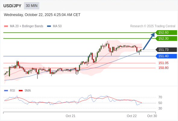 在 151.40 之上,看涨,目标价位为 152.30 ,然后为 152.60 。