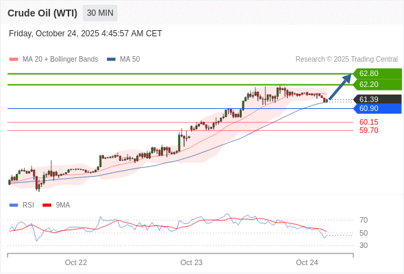 在 60.90 之上,看涨,目标价位为 62.20 ,然后为 62.80 。