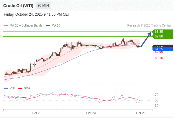 在 61.25 之上,看涨,目标价位为 62.80 ,然后为 63.30 。