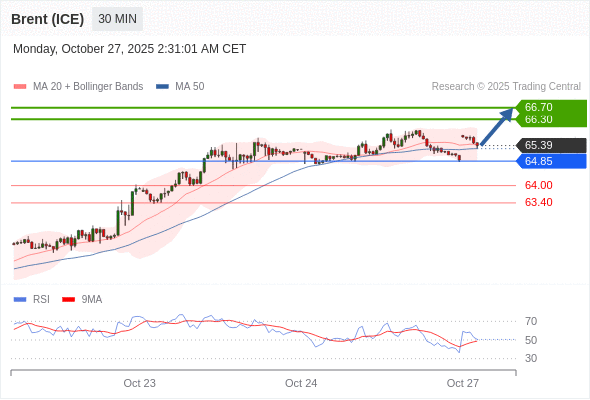 在 64.85 之上,看涨,目标价位为 66.30 ,然后为 66.70 。