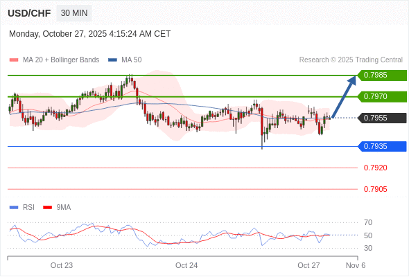美元/瑞郎 当日内: 在0.7935之上,看涨。