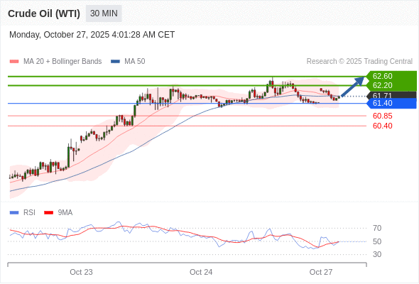 在 61.40 之上,看涨,目标价位为 62.20 ,然后为 62.60 。