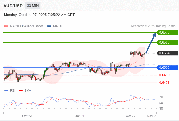 在 0.6505 之上,看涨,目标价位为 0.6555 ,然后为 0.6575 。