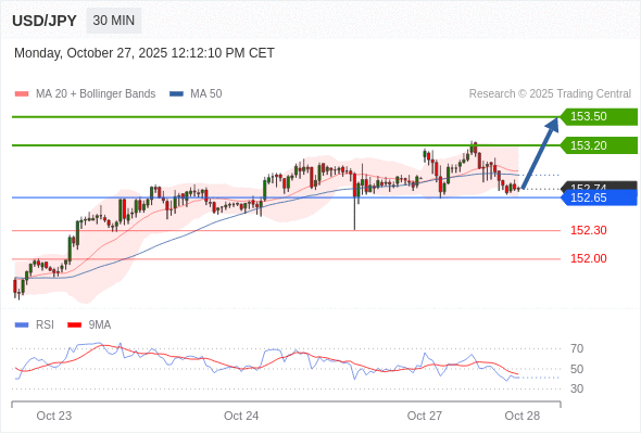 在 152.65 之上,看涨,目标价位为 153.20 ,然后为 153.50 。