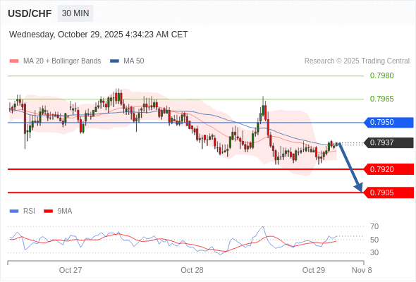 在 0.7950 之下,看跌,目标价位为 0.7920 ,然后为 0.7905 。