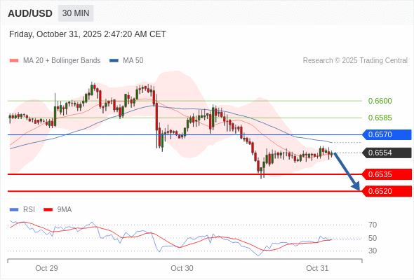 在 0.6570 之下,看跌,目标价位为 0.6535 ,然后为 0.6520 。