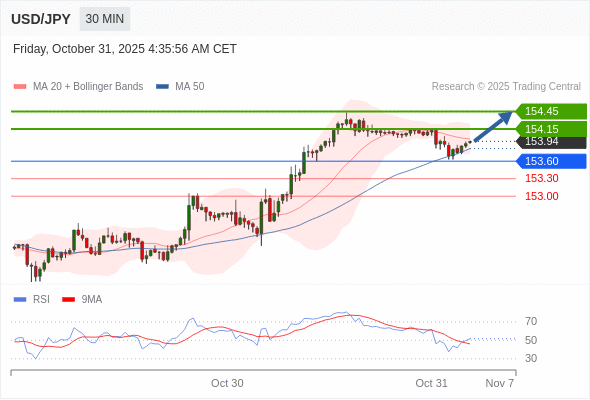 在 153.60 之上,看涨,目标价位为 154.15 ,然后为 154.45 。