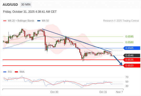 在 0.6565 之下,看跌,目标价位为 0.6535 ,然后为 0.6520 。