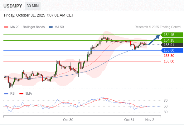 在 153.60 之上,看涨,目标价位为 154.15 ,然后为 154.45 。