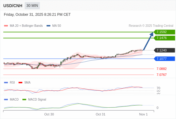 备选策略: 如跌破 7.1077 ,USD/CNH 目标方向定在 7.0882 和 7.0767 。
