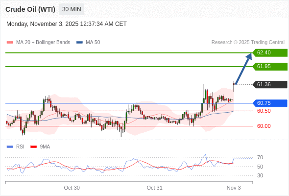 在 60.75 之上,看涨,目标价位为 61.95 ,然后为 62.40 。