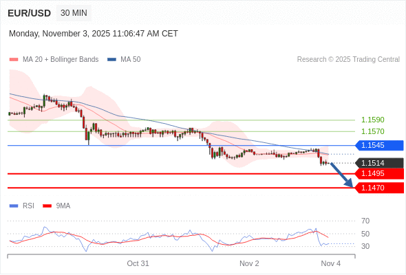 在 1.1545 之下,看跌,目标价位为 1.1495 ,然后为 1.1470 。