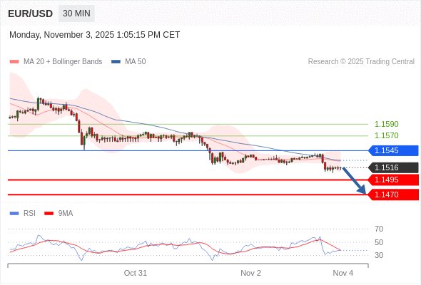 在 1.1545 之下,看跌,目标价位为 1.1495 ,然后为 1.1470 。