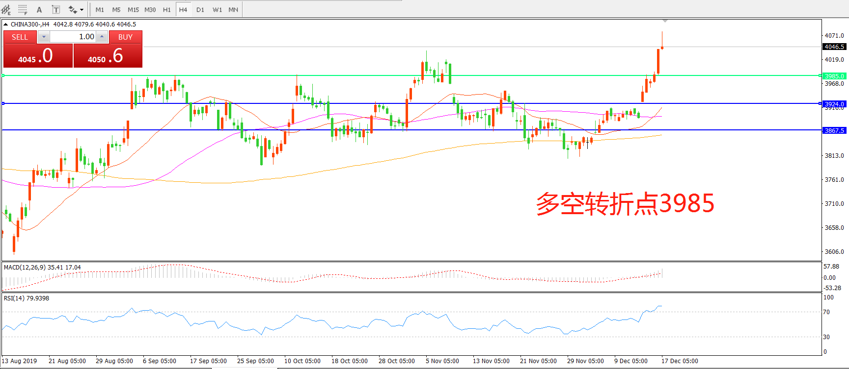 4小时图看,沪深300阳线连续拉升,整体走势偏强,均线系统走平,MACD红柱增加,RSI指标向上,日内延续上行概率较大。