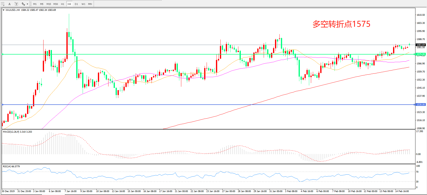 4小时图看,金价突破1575后震荡上行,整体走势偏强,均线系统逐渐拐头向上, MACD红柱增加,RSI指标走平,日内延续上行概率较大。
