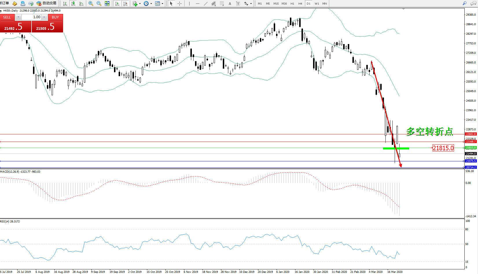 香港恒生指数3月23日(周一)收盘下跌1108.94点,跌幅4.86%,报21696.13点;海外疫情持续严峻,全球金融市场跌势未止。今日港A两地市场集体大跌,港股全日呈现大跌行情,行业板块近乎全部下跌。蓝筹权重股集体重挫。市场再度陷入恐慌之中。主板成交量为1375.49亿港元,港股通大幅净流入102.81亿港元。多项数据显示,香港经济环境正在不断恶化,零售销售已连续12个月呈现价量齐跌。香港现时的经济环境比2003年“非典”时期更加严峻。多个行业的中小企业正承受生意断崖式下跌、资金链断裂、裁员的危机。香港经济正处于水深火热之中。