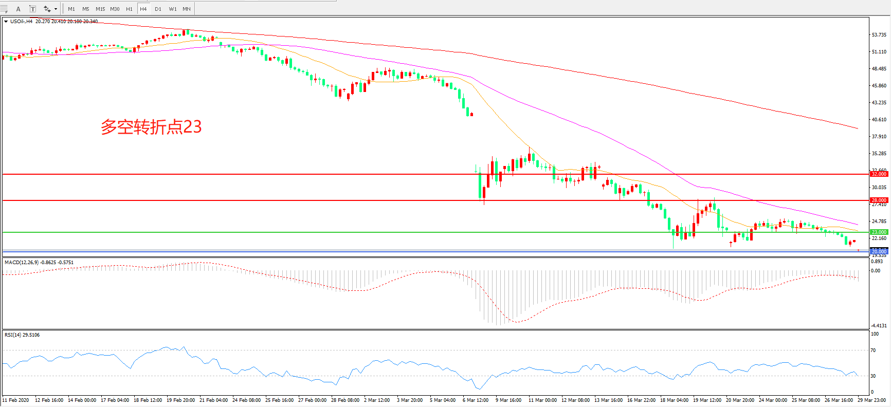 4小时图看,美油延续低位震荡,整体波幅不大,23美元成为短期多空分水岭,短期均线逐渐下压,MACD绿柱增加,RSI指标走平,日内延续震荡概率较大。