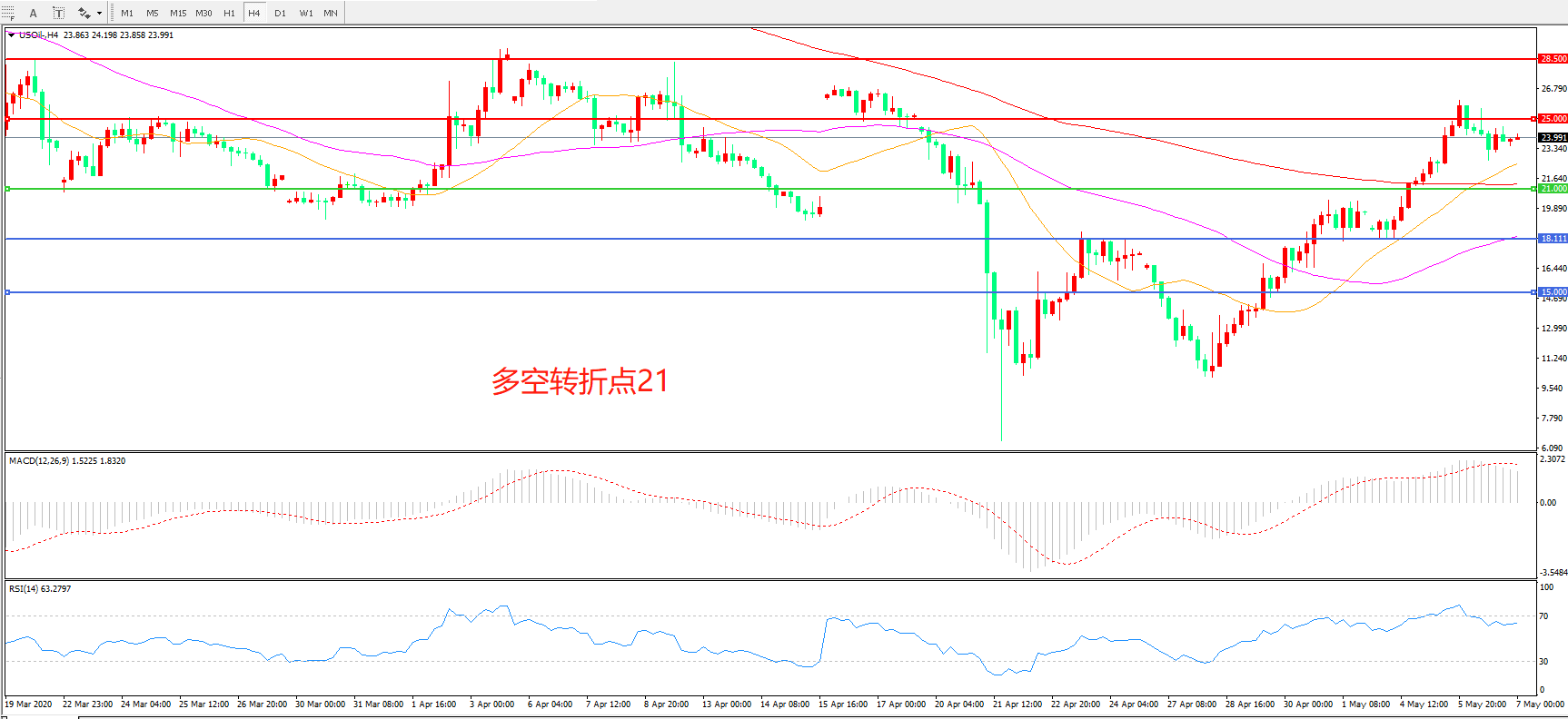4小时图看,油价冲高回落,涨势有放缓迹象,但上行通道仍然完整,均线系统拐头向上,MACD红柱增加,RSI指标走平,日内延续上行概率较大。