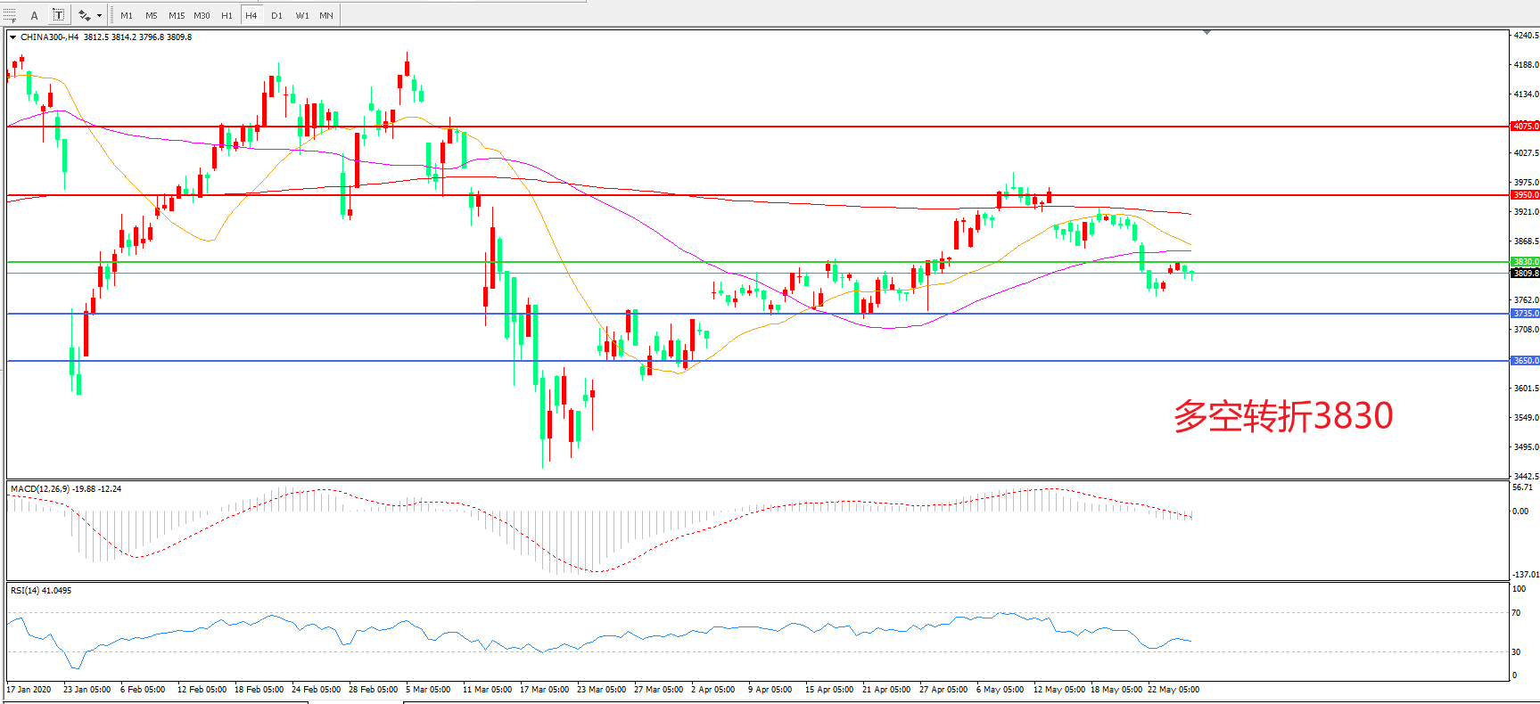 4小时图看,沪深300延续高位震荡, 3830成为短期多空分水岭,均线系统走平, 形成阻力区间,MACD红柱增加,RSI指标走平,日内延续震荡概率较大。