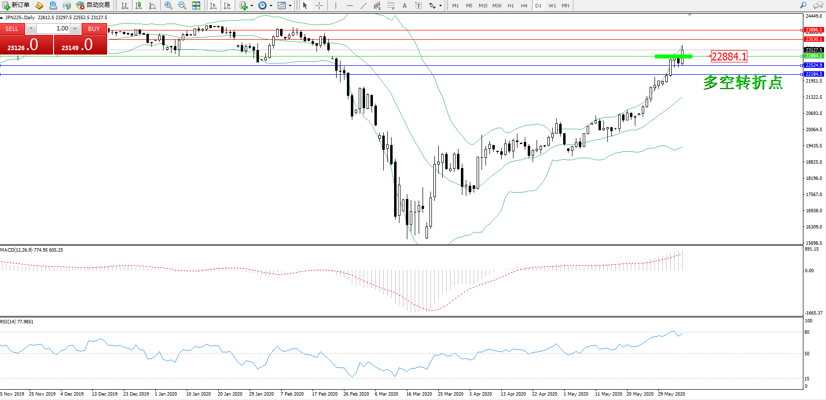 日经225指数6月5日(周五)收盘上涨164.26点,涨幅0.72%,报22860.00点。日本4月家庭支出以创纪录的速度下滑,新冠疫情导致人们无法旅行或外出就餐,而未来就业岗位流失可能增加,也打击了消费者信心。黯淡的数据将使决策者承受压力,要防止经济出现更大幅度的下滑。预期这个季度经济将进一步滑入衰退。周五公布的政府数据显示,4月家庭支出较上年同期下滑11.1%,为2001年有可比数据以来的最快下滑速度。3月降幅为6.0%。不过预估中值的降幅更大,为15.4%。预期消费在4月或5月已经触底反弹,因为上月解除了全国封锁措施之后,企业陆续恢复营业。不过他们说,由于企业和家庭对于支出仍很谨慎,复苏将会缓慢而脆弱;消息人士称,日本央行的预测反映了日本经济可能在4月或5月触底的观点,这加大了日本央行在6月利率评估时放弃大胆宽松措施的可能性,日本央行本月可能维持其认为日本经济将在今年下半年逐步复苏的观点。