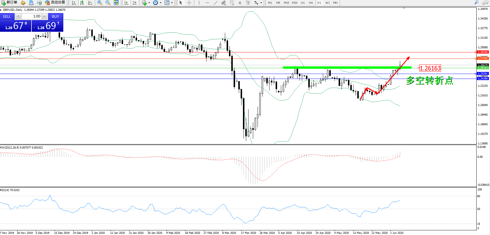 交易策略:1.26163上方看涨,目标1.25201、1.24390