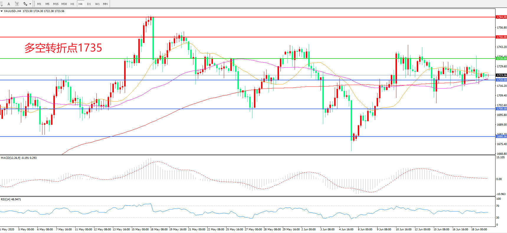 周四(6月18日),美元走强和地缘政治风险持续影响市场,多空双方博弈日趋胶着,金价延续窄幅震荡,收报1722.85美元/盎司。当前投资者仍在矛盾的消息环境中取舍,包括对第二轮疫情高峰来袭的担忧和对疫情下经济复苏的乐观情绪之间摸索,一旦市场获得更为明确的消息,黄金将很快突破近期整理区间,再次上行。