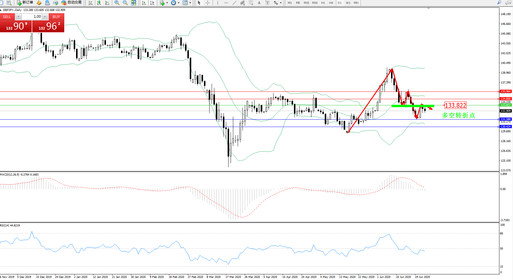技术点评:高位空头动力呈阶梯式震荡回撤至布林带指标中下轨区间弱势震荡向下移动中,布林带指标呈收口走势后开始维持整理平移中,在即将触及下轨附近得到短暂支撑,开始有回升迹象,但反转上行动力不足,依旧处于弱势,有继续下行态势,MACD指标空头动力弱势整理下移破0轴线进入空头区域窄幅整理中,RSI指标处于50均衡线下方维持窄幅震荡平移中;