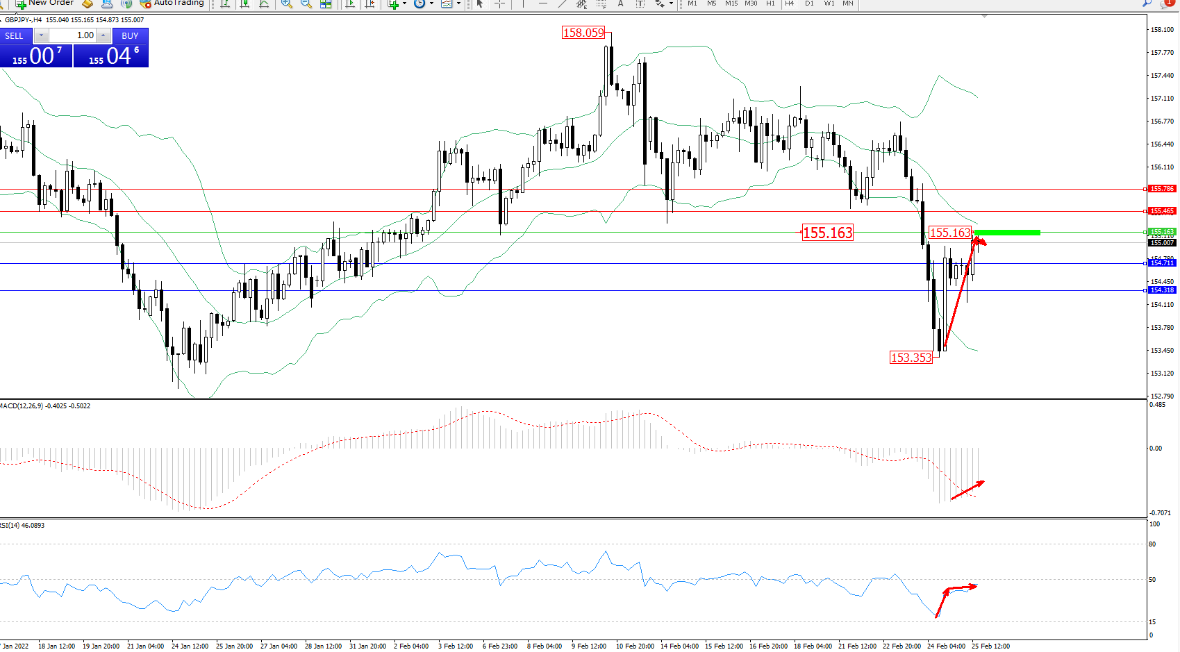 备选策略:155.163上方看涨,目标155.465、155.786