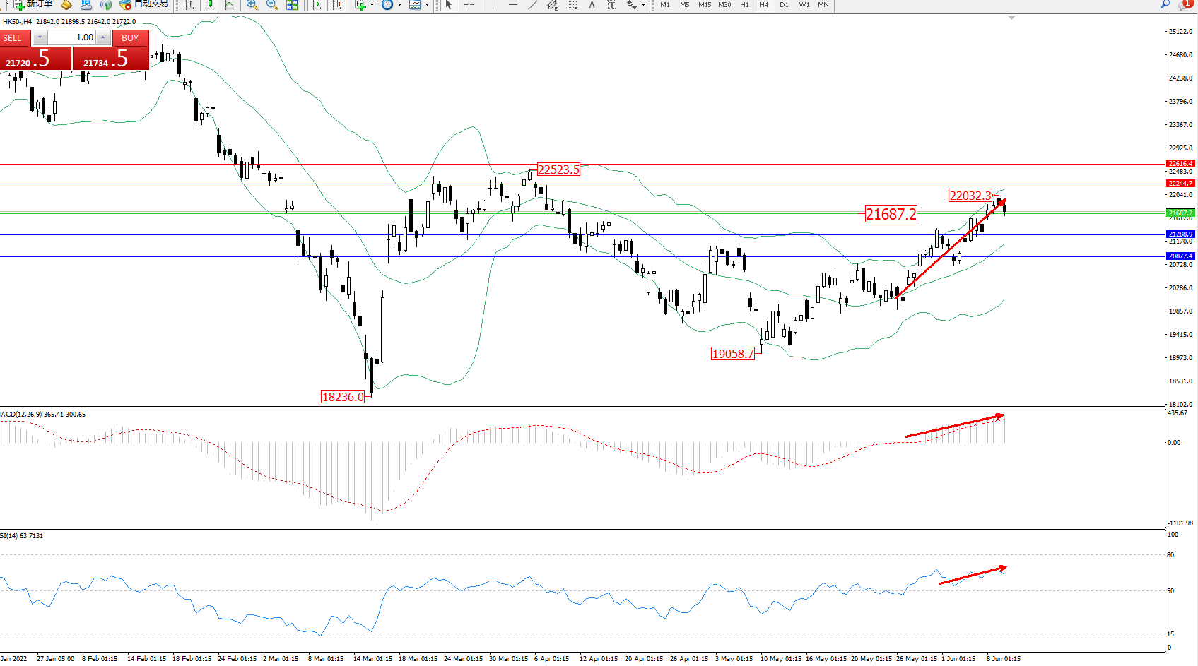 香港恒生指数6月9日(周四)收盘下跌145.54点,跌幅0.66%,报21869.05点;港股全天呈高开低走行情,三大指数昨日均创下反弹新高,今日市场情绪明显趋于谨慎。截止收盘,恒指跌0.66%22000点得而复失,恒生科技指数跌1.43%。连续上涨的科技股普跌,机构指下半年房地产市场有望迎来复苏,内房股与物管股全天表现强势,煤炭股、手游股普涨。