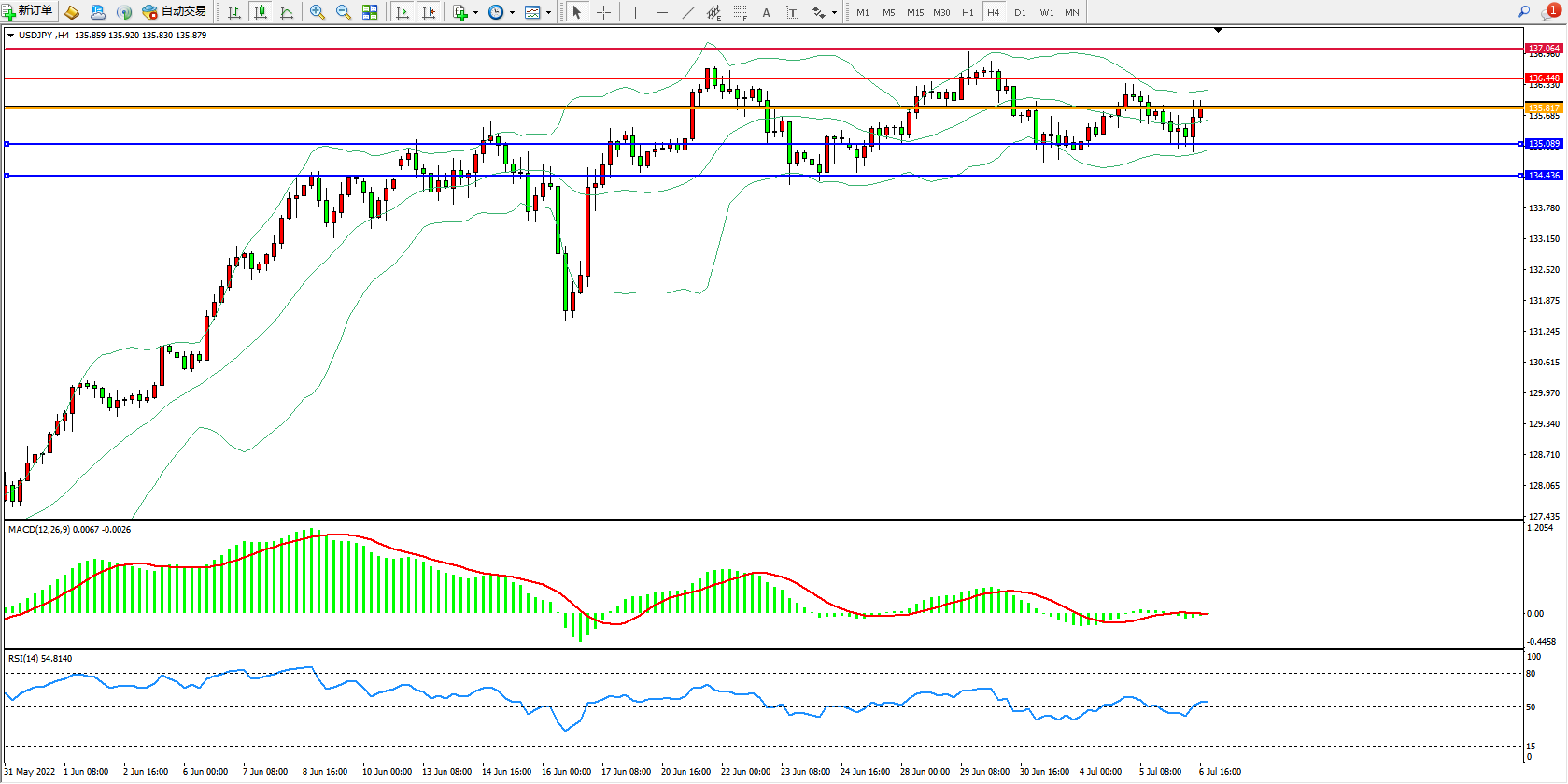 4小时图看:长时间维持在布林带指标通道窄幅震荡,波幅空间逐渐收窄,布林带指标呈收口走势中,MACD指标处于0轴线附近弱势徘徊,RSI指标处于50均衡线上側窄幅整理;