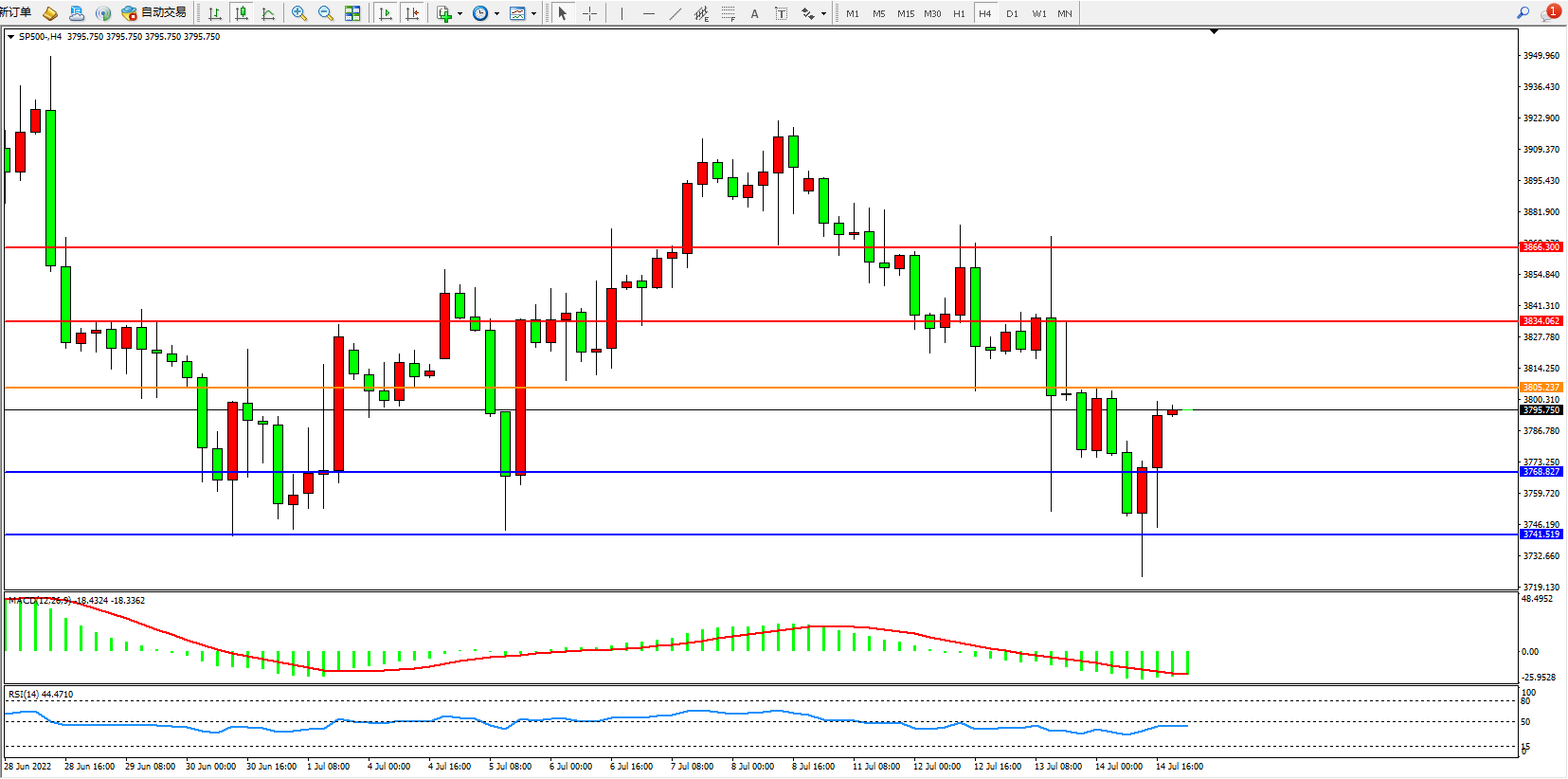 标普500指数7月14日(周四)收盘下跌11.88点,跌幅0.31%,报3789.90点;美银,将标普500指数年末目标位下调20%至3600点,并下调EPS增长预期,料美国下半年陷入衰退