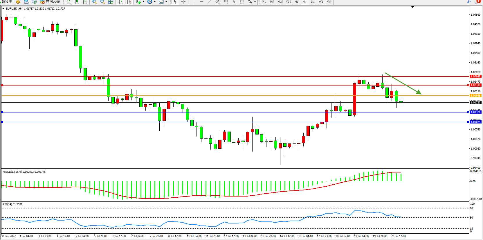 欧元美元EURUSD—4小时K线图显示: