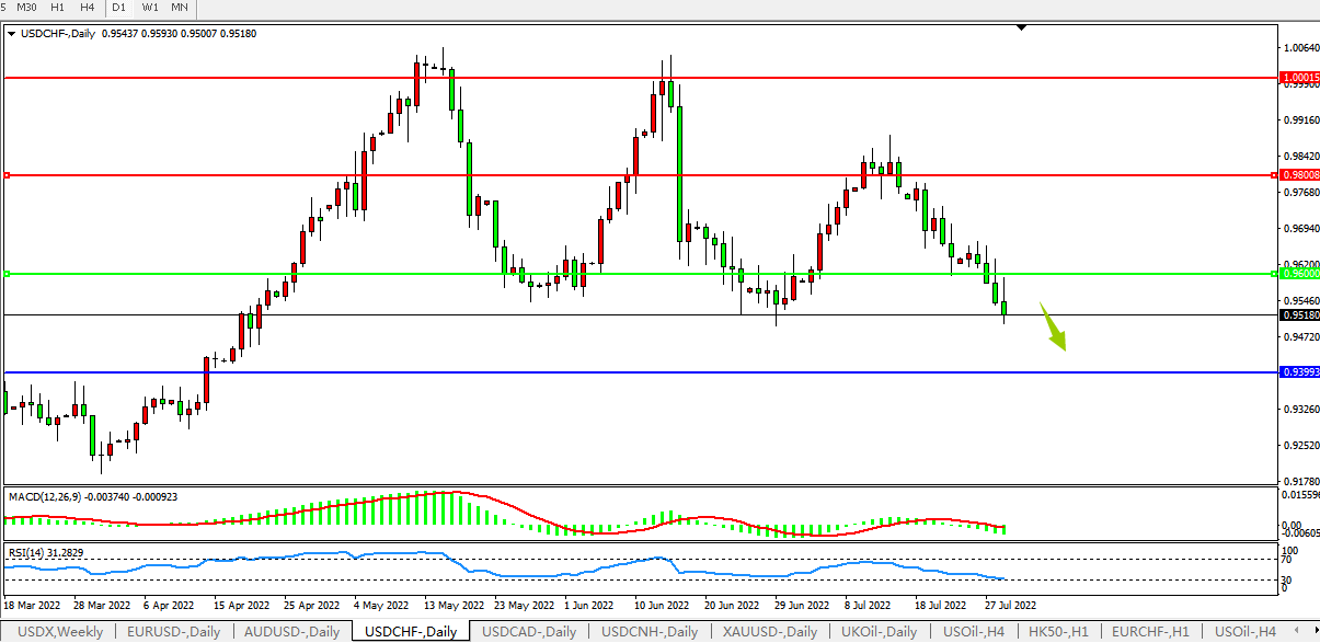 交易策略:0.9600下方看跌,目标0.9400、0.9200