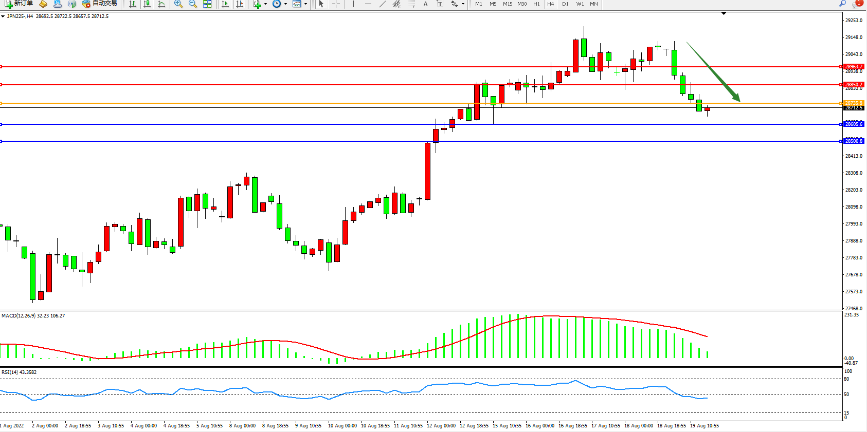 日经225指数8月19日(周五)收盘下跌20.64点,跌幅0.07%,报28921.50点。日本自从7月中旬进入“第七波”疫情以来,确诊感染人数屡创新高。截至8月17日,日本最近一个月累计新增确诊病例超过了600万例。18日,日本单日新增确诊病例超过25.5万例,再次达到历史新高。目前日本多地医疗资源紧张,冲绳县主岛地区新冠病床使用率已经超过100%。