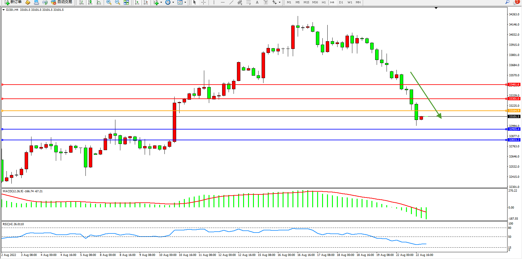 道琼斯指数8月22日(周一)收盘下跌642.80点,跌幅1.91%,报33063.94点;投资者对本周稍晚在怀俄明州杰克森霍尔举行的美联储研讨会感到紧张,预计美联储在会上将强调对遏制通胀的坚定承诺。