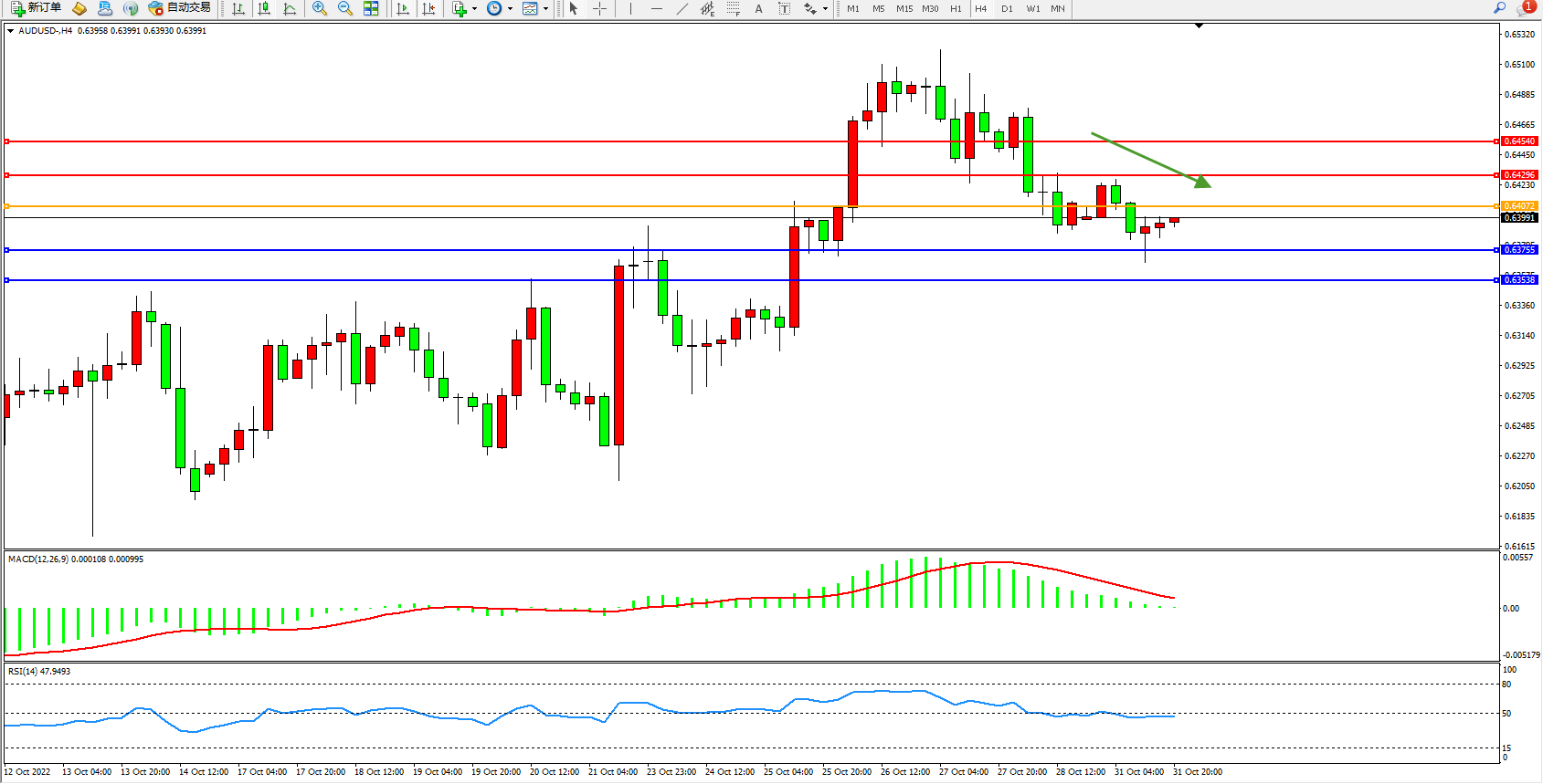 澳元兑美元维持0.63991附近震荡,澳洲联储预计将在周二加息25个基点至2.85%,但上周公布的第三季度通胀数据高企,可能将迫使央行总裁和政策委员会讨论加息50个基点。