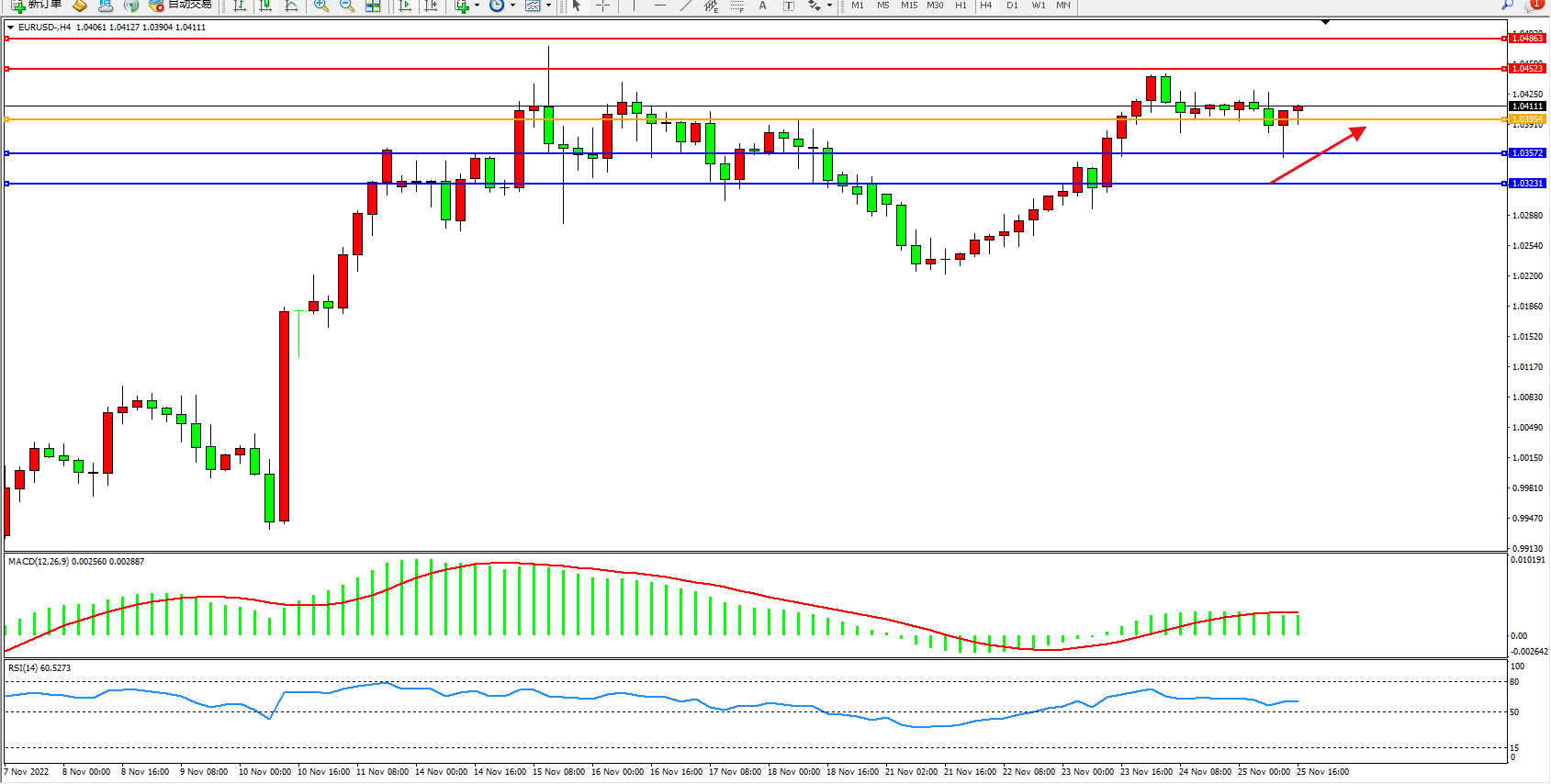 欧元美元EURUSD—4小时K线图显示: