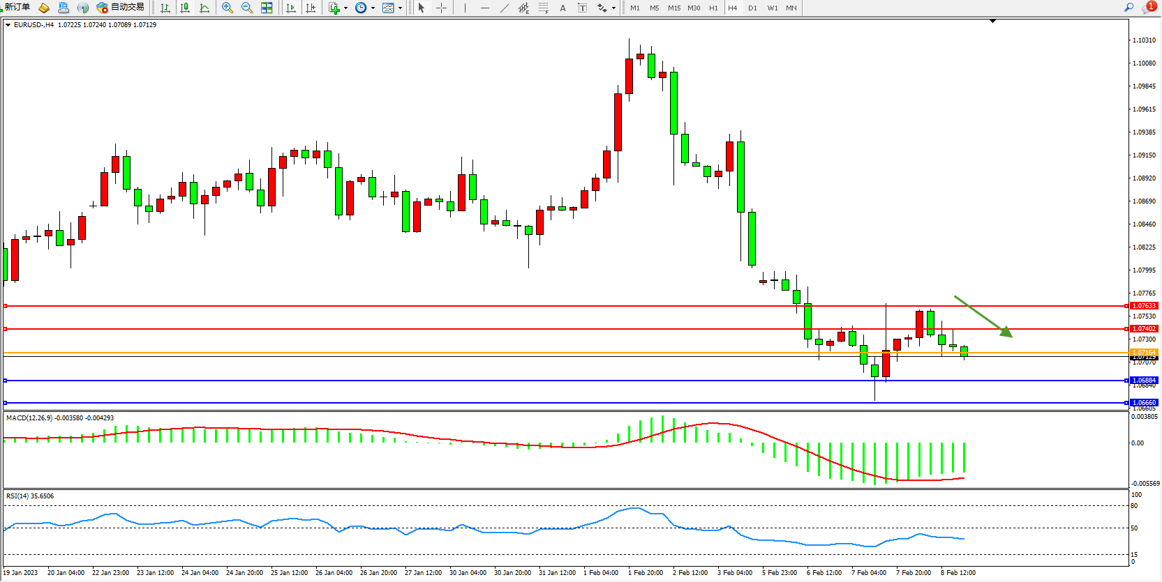 欧元美元EURUSD—4小时K线图显示: