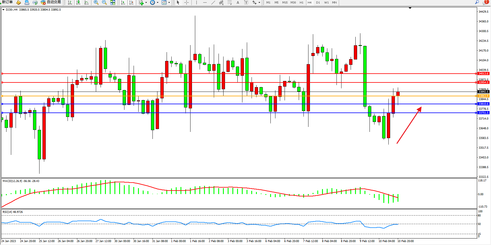 道琼斯指数2月10日(周五)收盘上涨169.52点,涨幅0.50%,报33869.40点;美国2月密歇根大学消费者信心指数初值 66.4,预期65,前值64.9。为2022年1月以来新高。目前的信心指数比一年前高出近6%,但仍比两年前(当前的通胀事件发生之前)低14%。