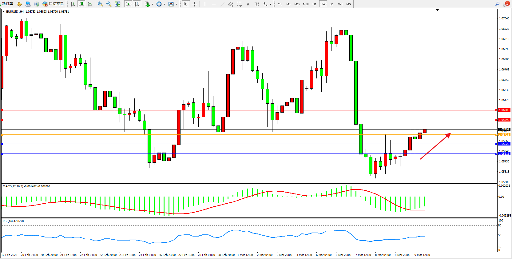 欧元美元EURUSD—4小时K线图显示: