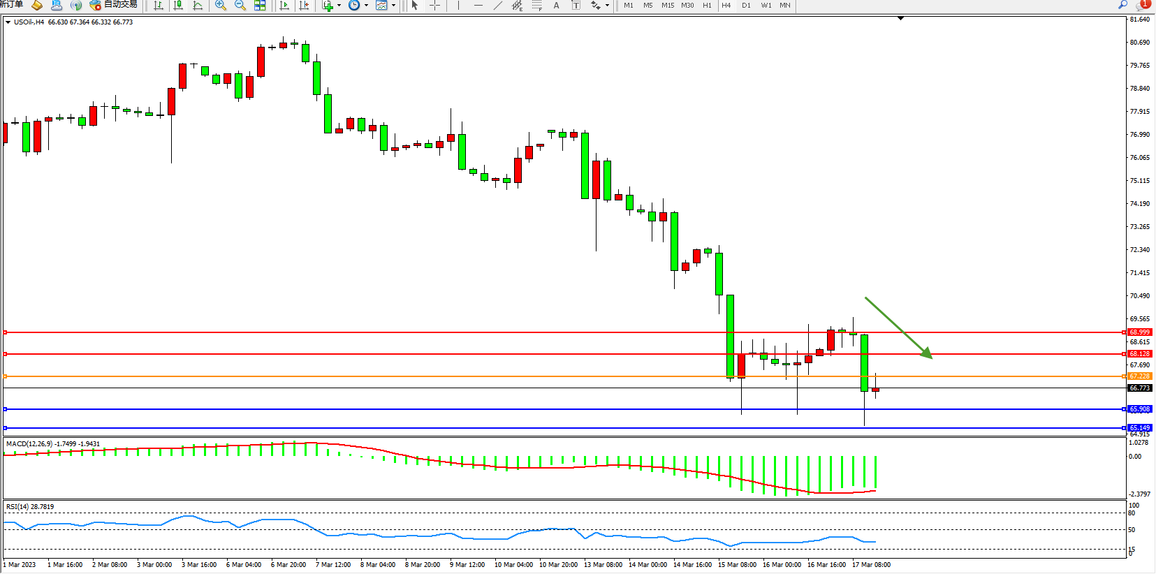 交易策略:67.228下方看跌,目标65.908  65.149